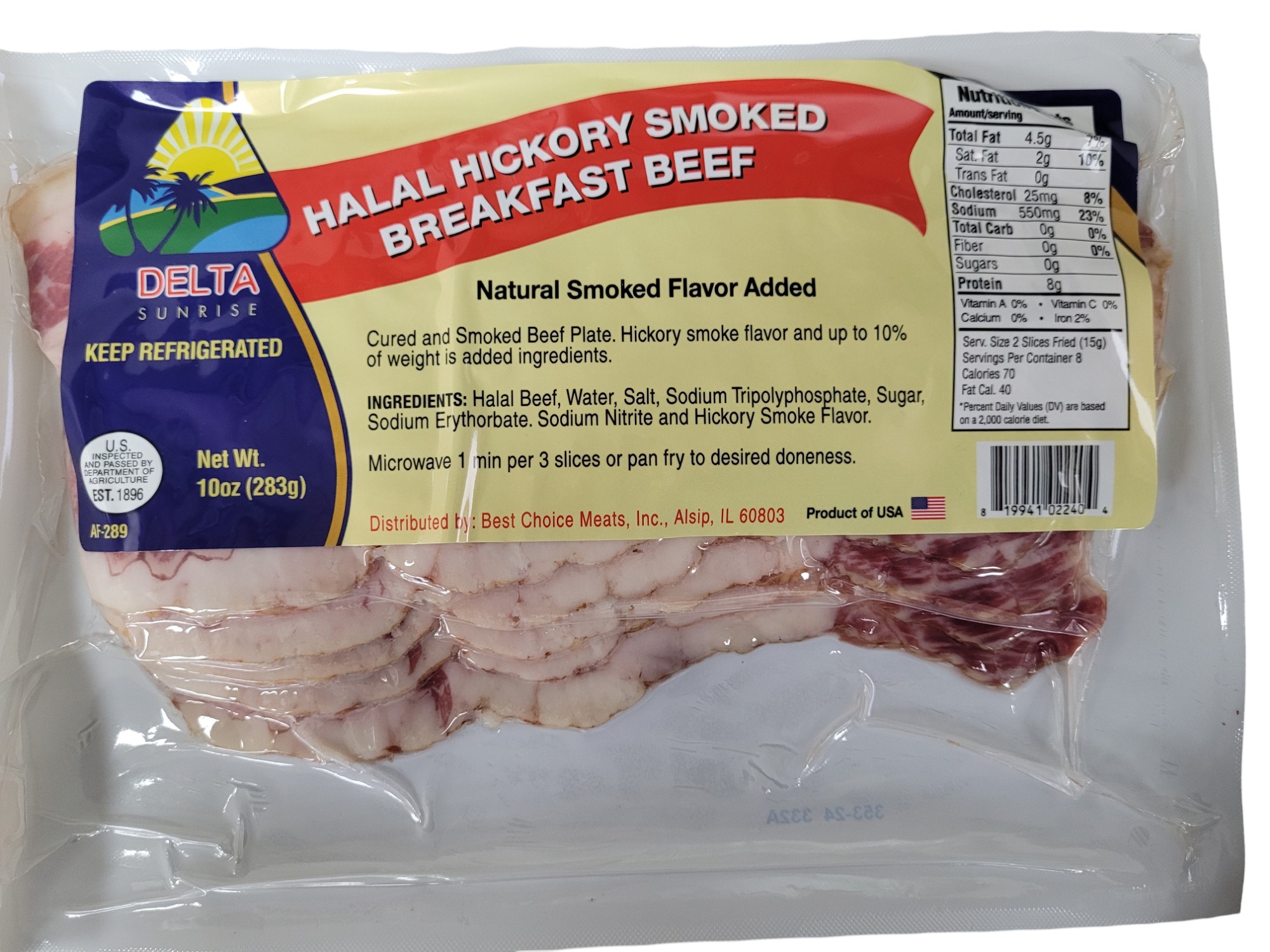 BACON, BEEF STRIP HICKORY SMOKED RAW FROZEN BREAKFAST – 16/10 OZ