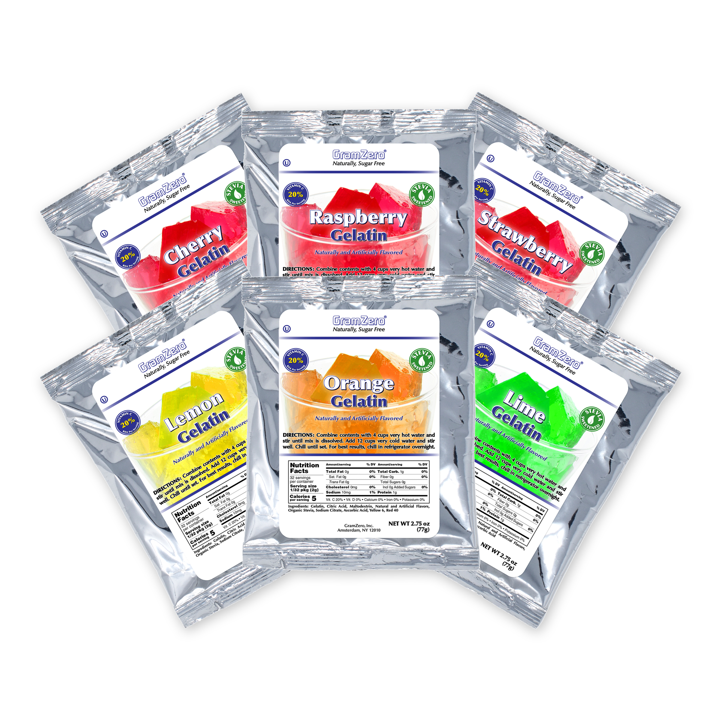 Delivers within 3-5 business days. SUGAR FREE ASSORTED GELATIN MIX WITH ORGANIC STEVIA, 2 POUCHES EACH CHERRY, RASPBERRY, STRAWBERRY, LIME, ORANGE, LEMON, CASE YIELD IS 12/1 GAL WITH WATER ADDED, SUITABLE FOR DIABETIC AND ALL DIETS. For additional product